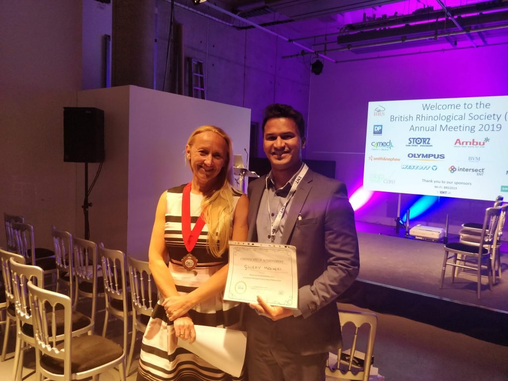 Dr Gaurav Medikeri with Dr Claire Hopkins- President of British Rhinological society who handed over the award for his research work on use of intranasal probiotics in rhino sinusitis.