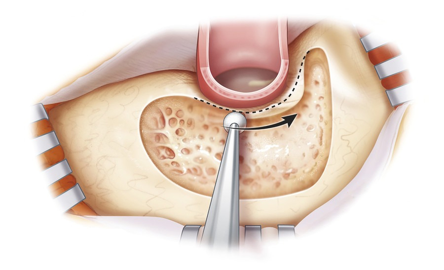 A postauricular incision is made behind the ear to access the mastoid bone. Using a surgical drill, infected or diseased air cells are carefully removed while preserving critical structures like the facial nerve and ossicles. In some cases, ossicular reconstruction or tympanoplasty may be performed simultaneously.